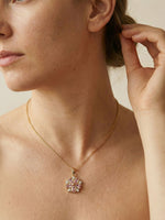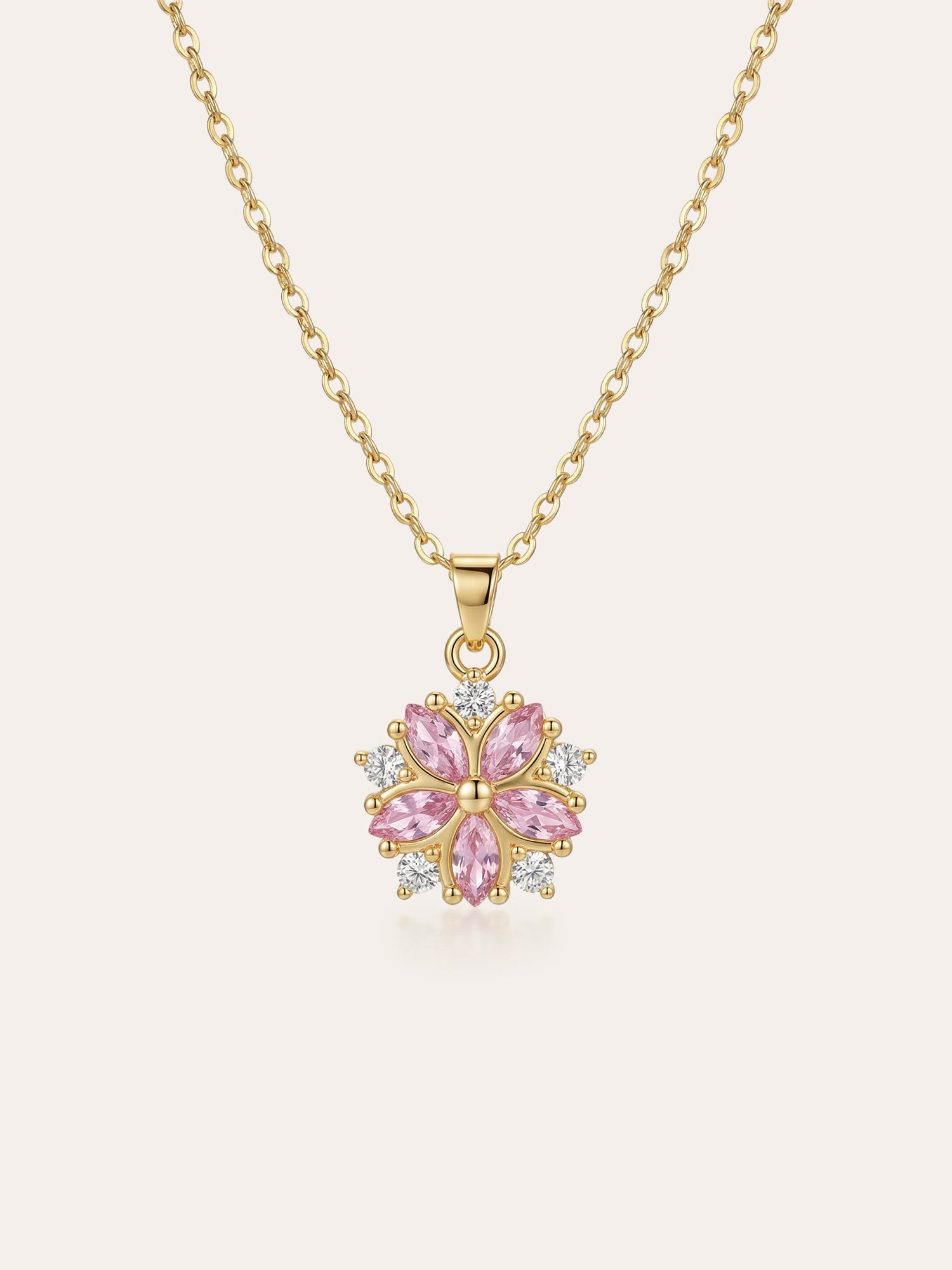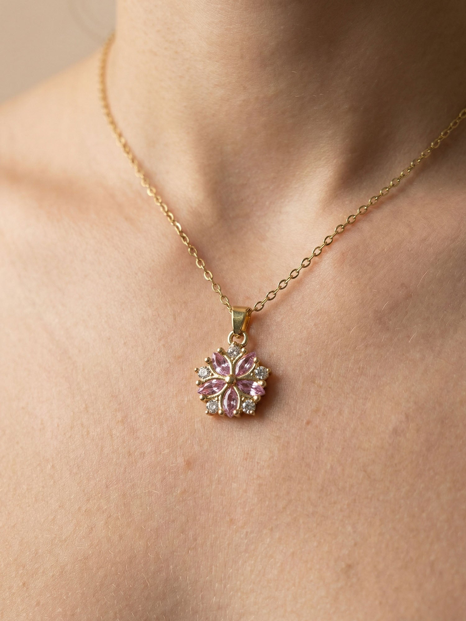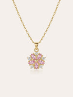 Der Anhänger kombiniert rosafarbene Kristalle mit klaren Zirkonia-Steinen und greift die typische Blütenform der Kirschblüte auf.