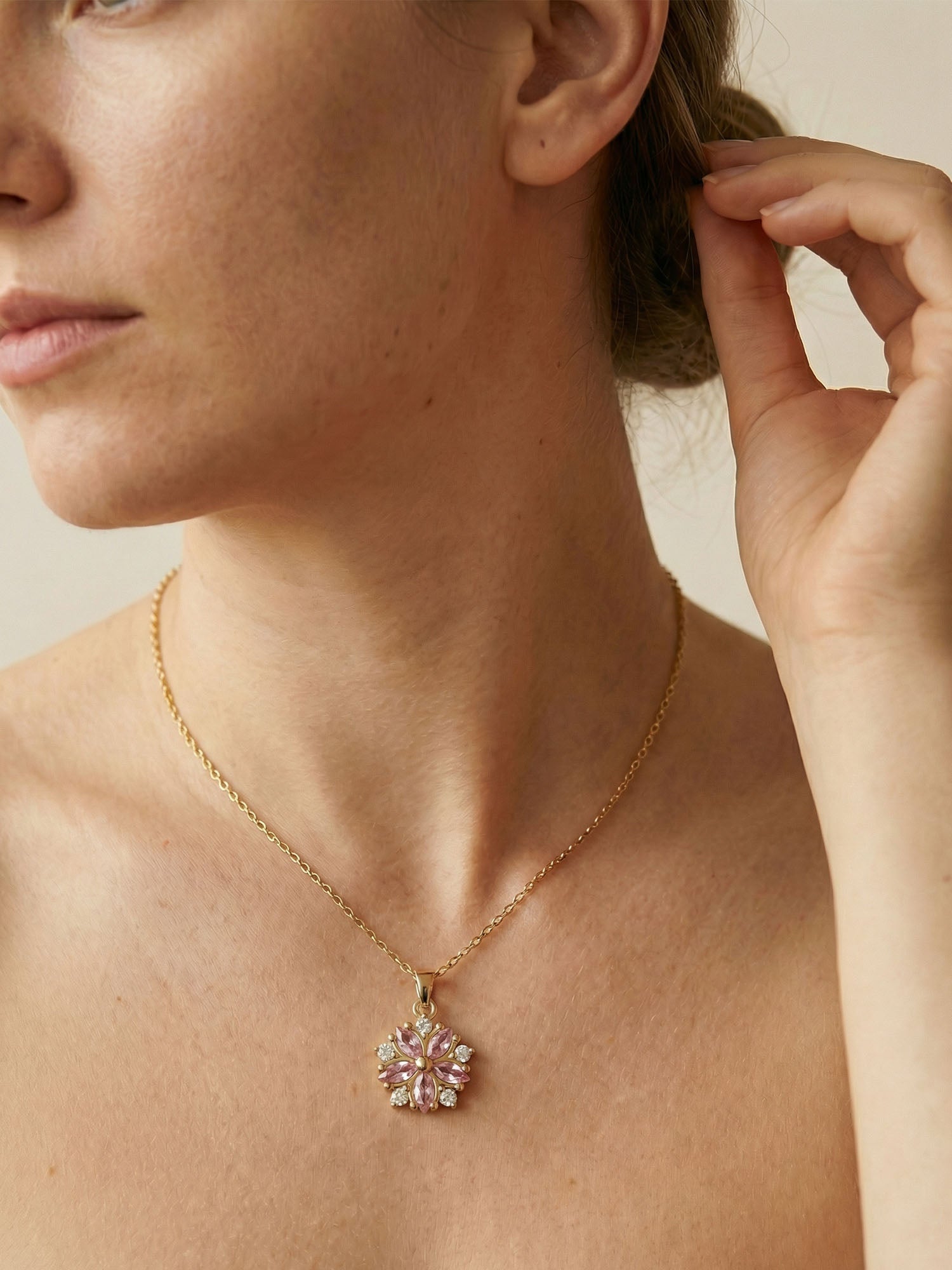 Die feinen Steine bilden eine florale Silhouette, die leicht am Hals liegt und einen sanften Farbakzent setzt.