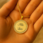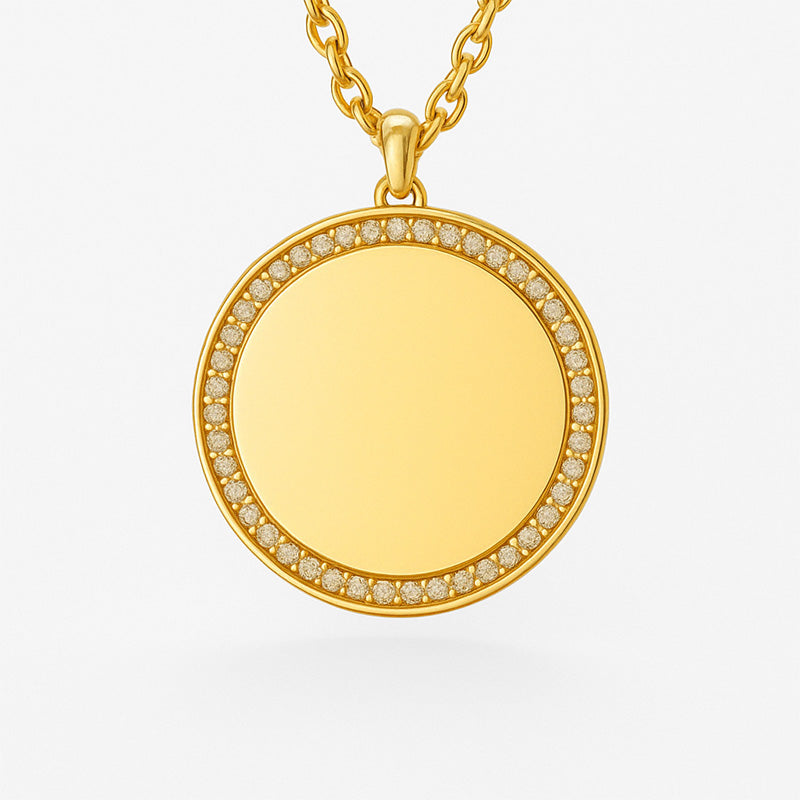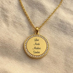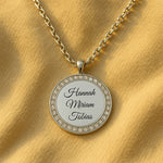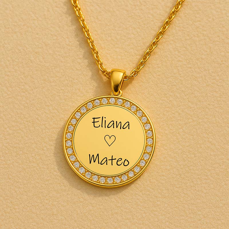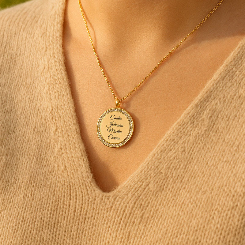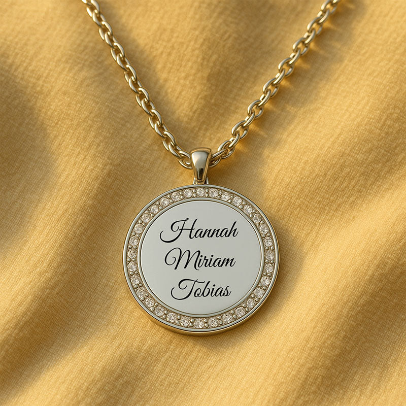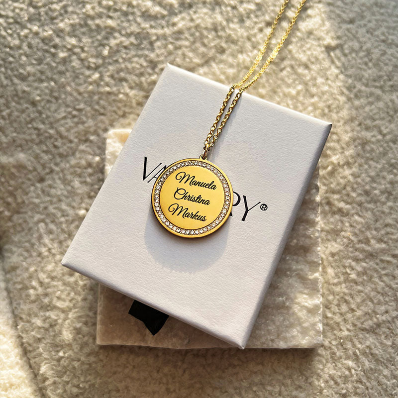 Diese hochwertige Gravur-Halskette vereint zeitloses Design mit persönlicher Bedeutung. Der runde Anhänger wird von funkelnden Zirkonia eingefasst und trägt im Zentrum das, was dir am wichtigsten ist: die Namen deiner Liebsten, deines Kindes, deiner Familie oder ein Wort, das dich durchs Leben trägt.