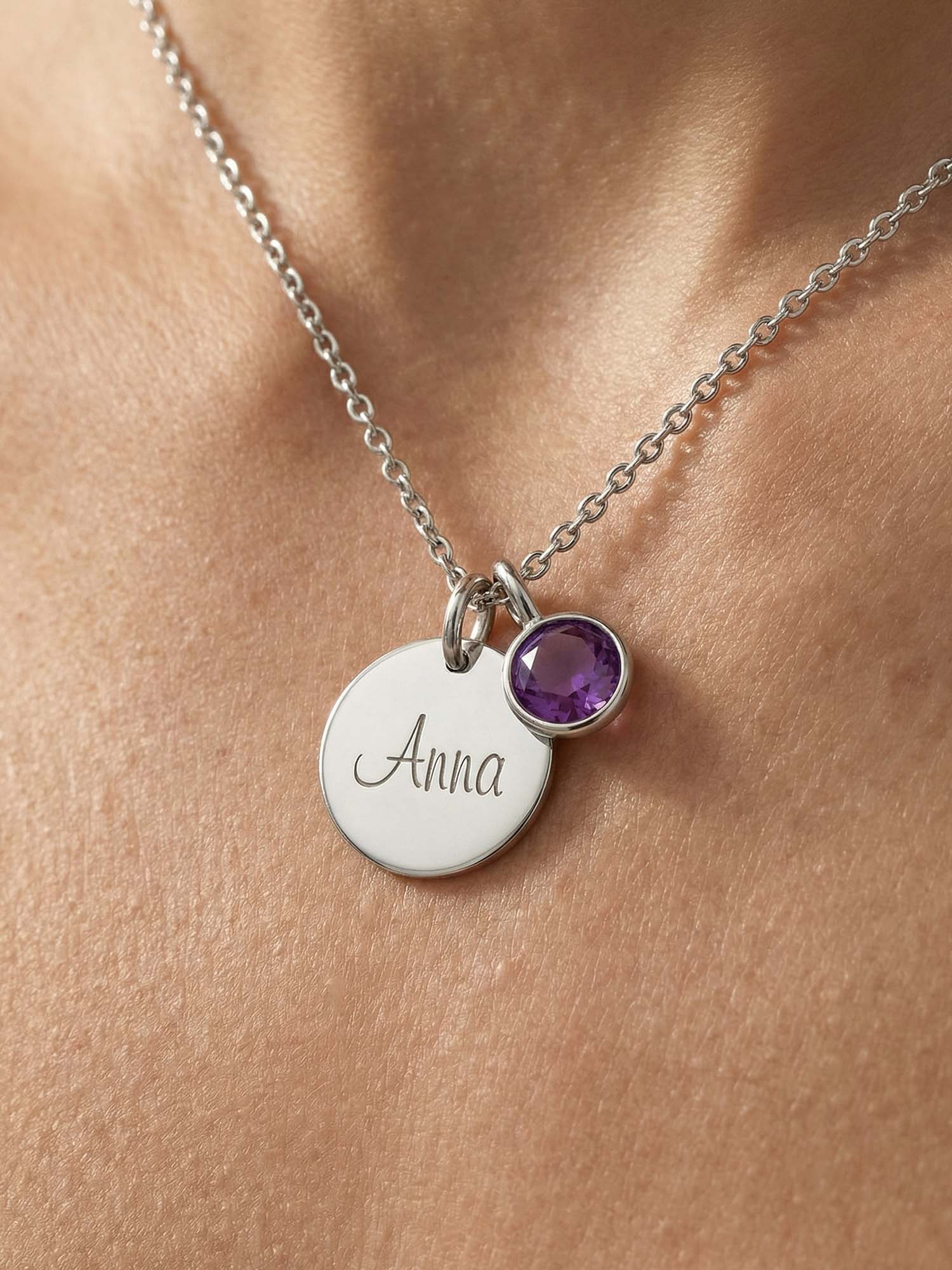 Melia combines a name engraving with a birthstone in the color of the chosen month.