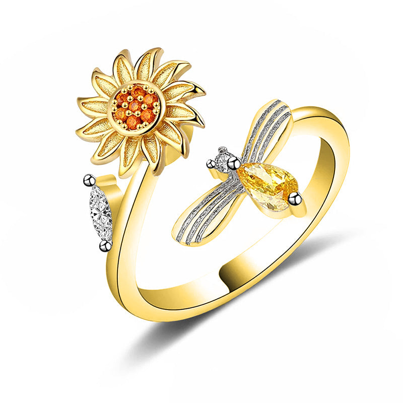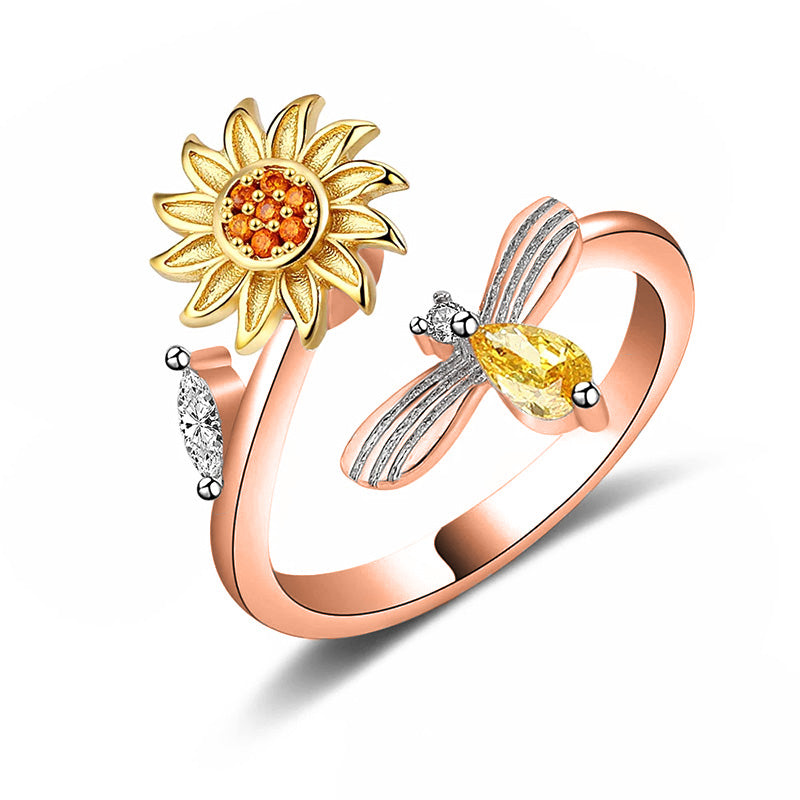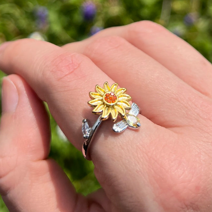Découvrez Sérénité avec notre élégant et doux bague, décoré d'un tournesol rotatif et rayonnant et d'une abeille étincelante.